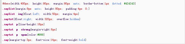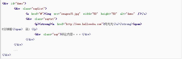 上述HTML結(jié)構(gòu)由N個(gè).saylist構(gòu)成,用于展示用戶的評(píng)論信息,當(dāng)然在本例中,將由PHP負(fù)責(zé)生成這段XHTML代碼。