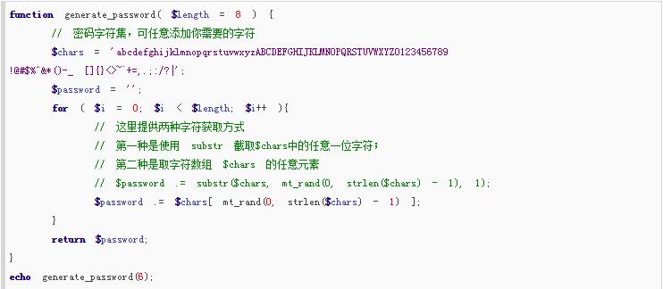 1、預(yù)置一個的字符串 $chars ,包括 a – z,A – Z,0 – 9,以及一些特殊字符