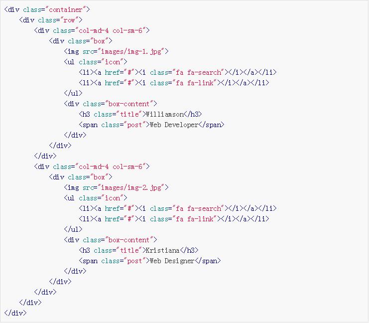 示例中,我們使用Bootstrap布局,該css3鼠標經(jīng)過動畫特效的HTML結(jié)構(gòu)如下: